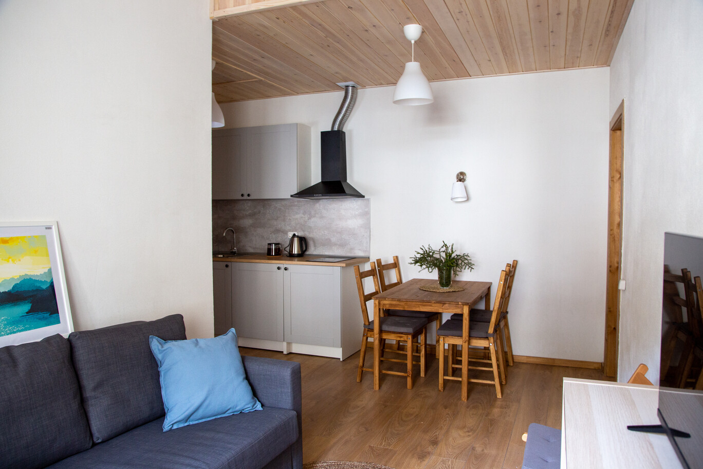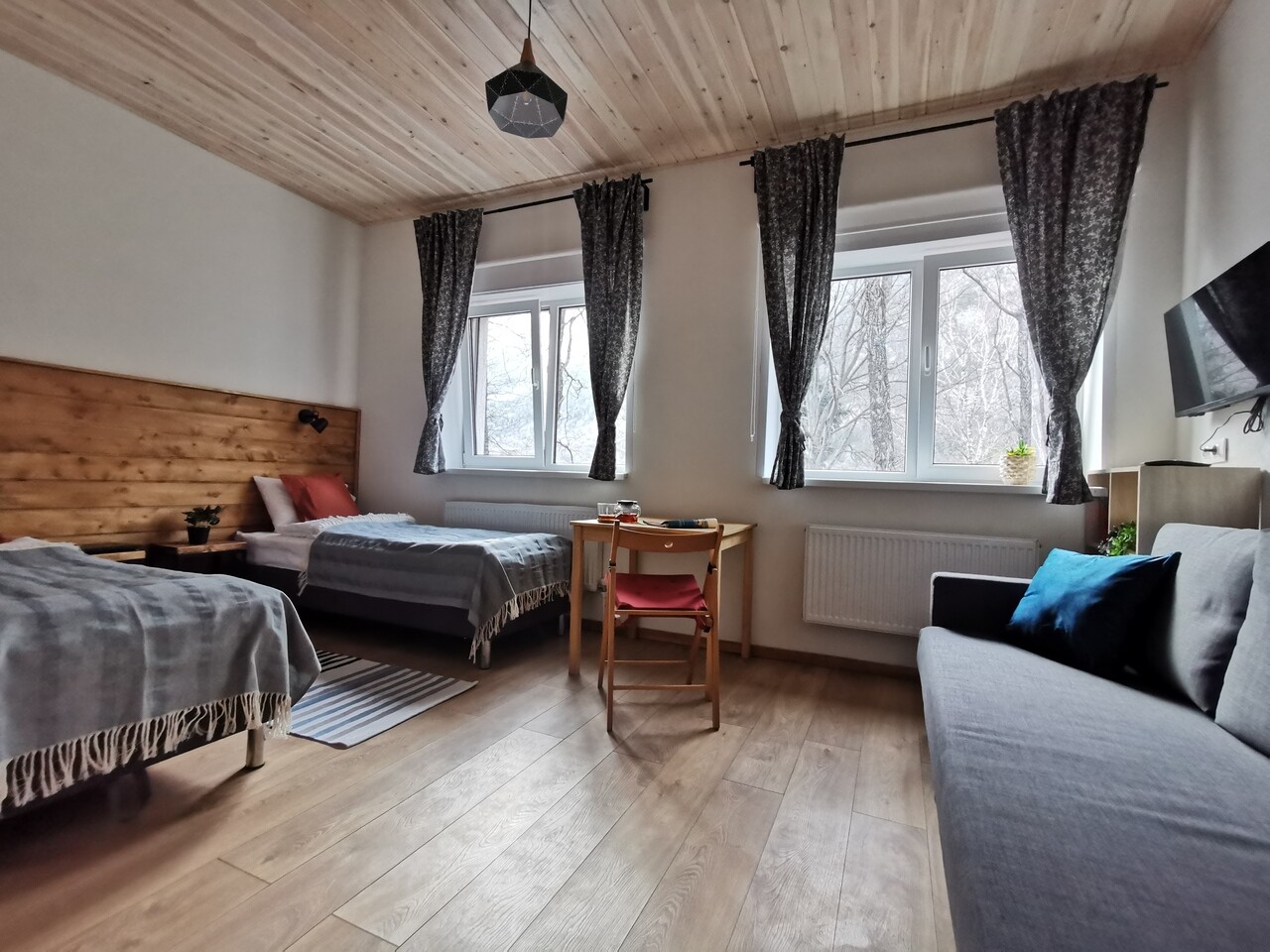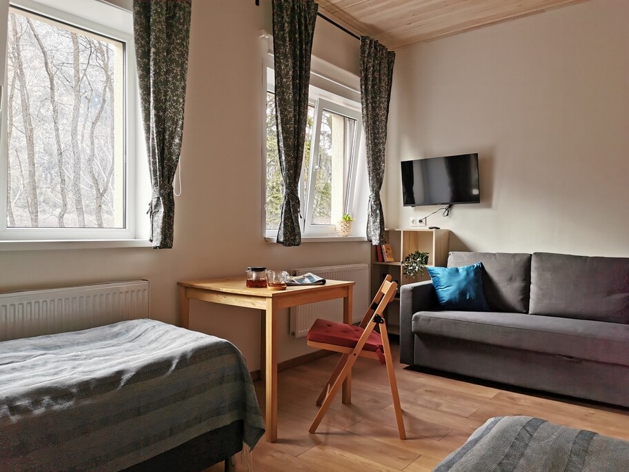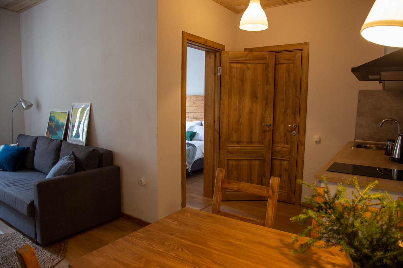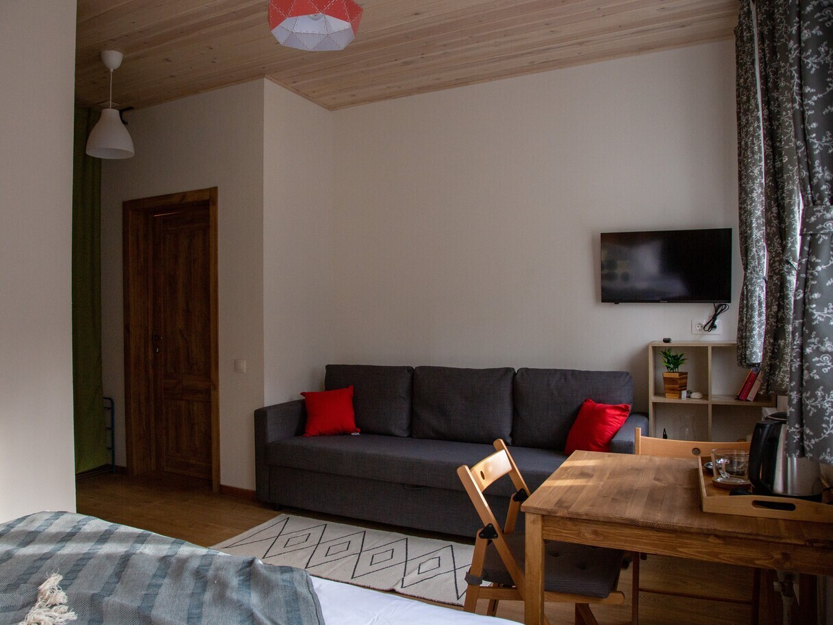Описание - уютный двухкомнатный номер апартаменты с собственной кухней, оборудованный всем необходимым для комфортного проживания. В номере 2 комнаты, кухня-гостиная и спальня. Номер подойдет для размещения 3 взрослых или семьи из 2 взрослых и 2 детей. В номере 3 отдельных спальных места, диван-кровать и 2 отдельные кровати, кровати можно трансформировать из односпальных в двуспальную.